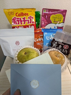 梨やご当地の味噌、地元九州を感じられるようなお菓子などをいっぱい詰めて送りました。