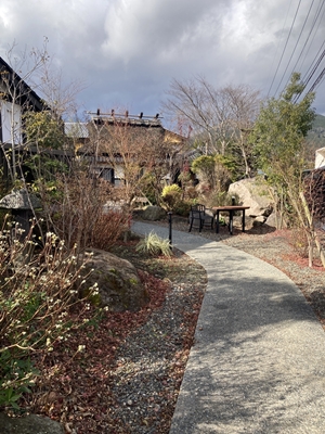 駐車場からフロントのある建物まで、蛇行している長めのアプローチが続きます。植栽が先の景色をうまく隠しており、何があるのかとワクワクしながら歩きました。