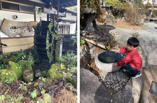 敷地内をもうもうと湯気がたちこめている中、実際に動いている水車を発見!水車にもまわりの石にもいい具合に苔が生えており風情を感じます。脇にあったつくばい(石の鉢)に手をいれると、子どもが「あったかい!」と言ったので、ここも温泉がでているようです。